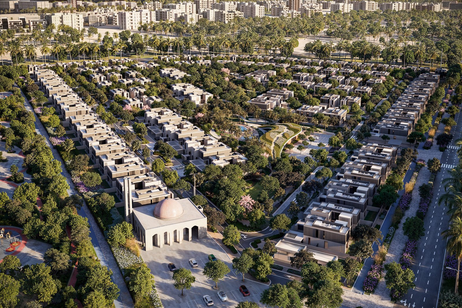 In addition to its landscaped parks, residents enjoy a wide range of wellness-focused amenities, including a jogging track, yoga pavilion, outdoor fitness areas, sound-healing spaces, and a wellness café. Shaded green corridors, pedestrian pathways, and open community plazas enhance walkability and encourage social interaction, creating a comfortable and connected neighborhood environment.
